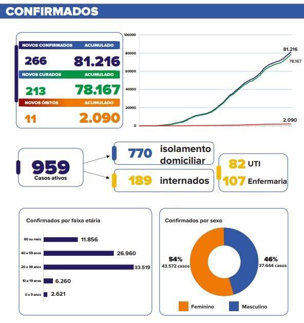 Foram registrados 266 novos casos nas últimas 24 horas e o município chegou a 81.216 confirmações. Londrina soma ainda 959 pessoas infectadas e com o vírus ativo. Desse total, 770 estão em isolamento domiciliar e 189 internados - 107 na enfermaria e 82 na Unidade de Terapia Intensiva (UTI).