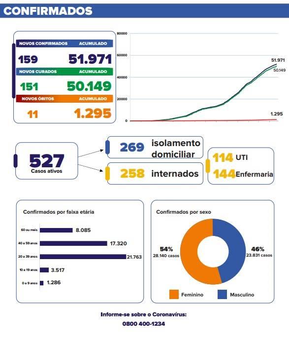 Foram registrados 159 novos casos nas últimas 24 horas, o município chegou a 51.971 confirmações. São 527 casos ativos, sendo 269 em isolamento domiciliar com acompanhamento das equipes médicas e 258 internados - 144 na enfermaria e 114 na Unidade de Terapia Intensiva (UTI).