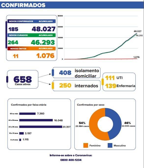 Os números também continuam subindo com 185 novos casos nas últimas 24 horas, o município chegou a 48.027 confirmações. São 658 casos ativos, sendo 408 em isolamento domiciliar com acompanhamento das equipes médicas e 250 internados - 139 na enfermaria e 111 na Unidade de Terapia Intensiva (UTI).