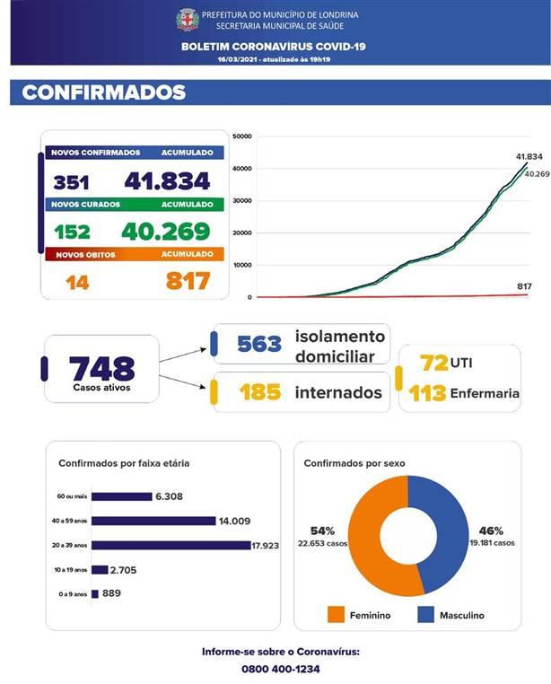 O novo boletim, divulgado na noite desta terça-feira (16), aponta que o número de óbitos continua aumentando expressivamente em Londrina em decorrência da Covid-19. Somente neste levantamento, foram registradas mais 14 mortes de moradores da cidade. Quase igualou o recorde em apenas um boletim, que foi batido na última segunda-feira (15), com 15 registros. No total, são 817 munícipes que perderam a vida na pandemia.