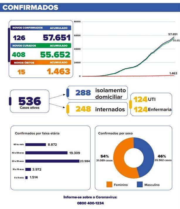 Foram registrados 123 novos casos nas últimas 24 horas, o município chegou a 57.651 confirmações. Londrina registra ainda 536 casos ativos, sendo 288 em isolamento domiciliar com acompanhamento das equipes médicas e 248 internados - 124 na enfermaria e 124 na Unidade de Terapia Intensiva (UTI).