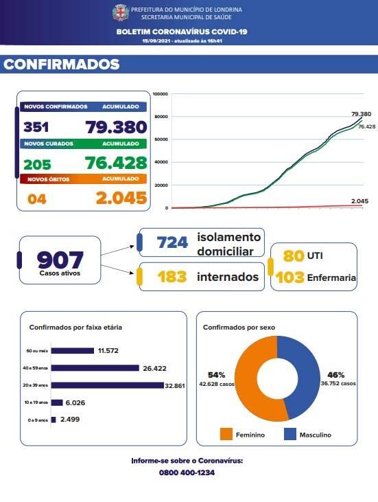 Foram registrados 351 novos casos nas últimas 24 horas e o município chegou a 79.380 confirmações. Londrina soma ainda 907 pessoas infectadas e com o vírus ativo. Desse total, 724 estão em isolamento domiciliar e 183 internados - 103 na enfermaria e 80 na UTI na Unidade de Terapia Intensiva (UTI).
