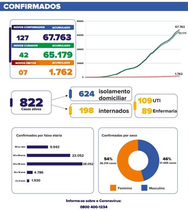 Mais 42 pacientes se recuperaram e agora o número dos considerados curados da doença chegou a 65.179. Atualmente, são 83 pessoas com sintomas da doença que aguardam resultados de exames.