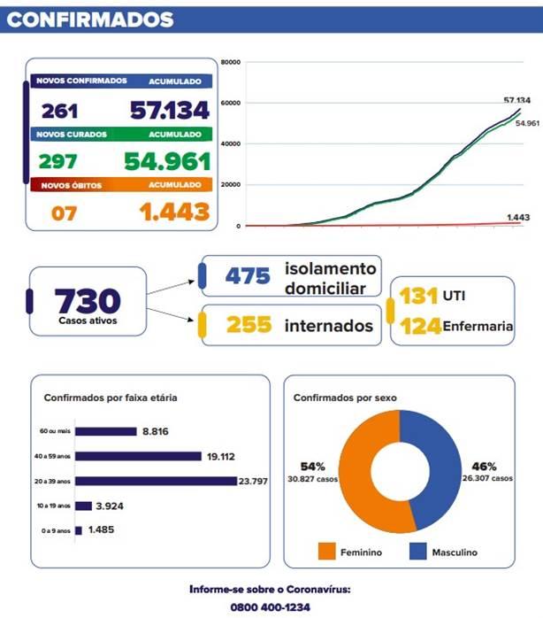 Foram registrados 261 novos casos nas últimas 24 horas, o município chegou a 56.873 confirmações. São 730 casos ativos, sendo 475 em isolamento domiciliar com acompanhamento das equipes médicas e 255 internados - 124 na enfermaria e 131 na Unidade de Terapia Intensiva (UTI).