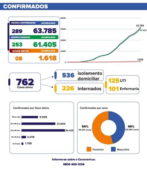 Foram registrados 289 novos casos nas últimas 24 horas, o município chegou a 63.785 confirmações. Londrina registra ainda 762 casos ativos, sendo 535 em isolamento domiciliar com acompanhamento das equipes médicas e 226 internados - 101 na enfermaria e 125 na Unidade de Terapia Intensiva (UTI).