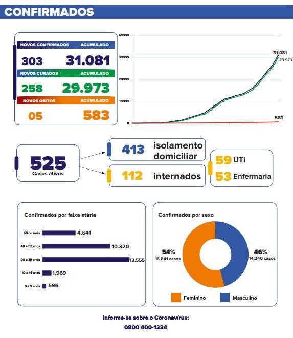 Os números continuam subindo expressivamente com mais 303 novos casos nas últimas 24 horas, o município chegou a 31.081 confirmações. São 525 casos ativos, sendo 413 em isolamento domiciliar com acompanhamento das equipes médicas e 112 internados - 53 na enfermaria e 59 na Unidade de Terapia Intensiva (UTI). Com isso, a taxa de ocupação de UTI geral adulto chegou a 73% e entre leitos exclusivos para Covid-19, a taxa é de 85%.