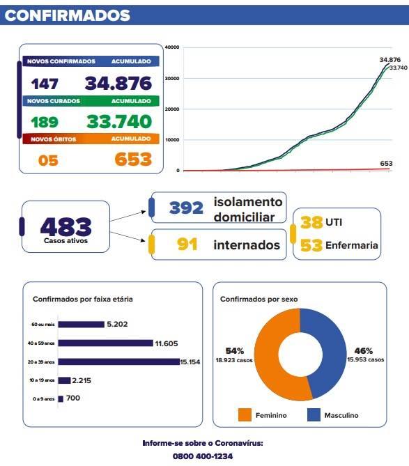 Os números continuam subindo expressivamente com mais 147 novos casos nas últimas 24 horas, o município chegou a 34.876 confirmações. São 483 casos ativos, sendo 392 em isolamento domiciliar com acompanhamento das equipes médicas e 91 internados - 53 na enfermaria e 38 na Unidade de Terapia Intensiva (UTI).