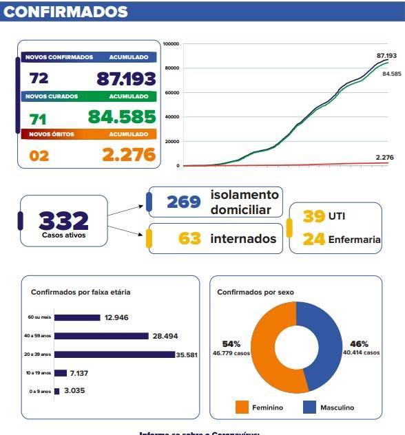 O município já atingiu 2.276 óbitos desde o início da pandemia. Foram registrados 72 novos casos nas últimas 24 horas e o município chegou a 87.193 confirmações.