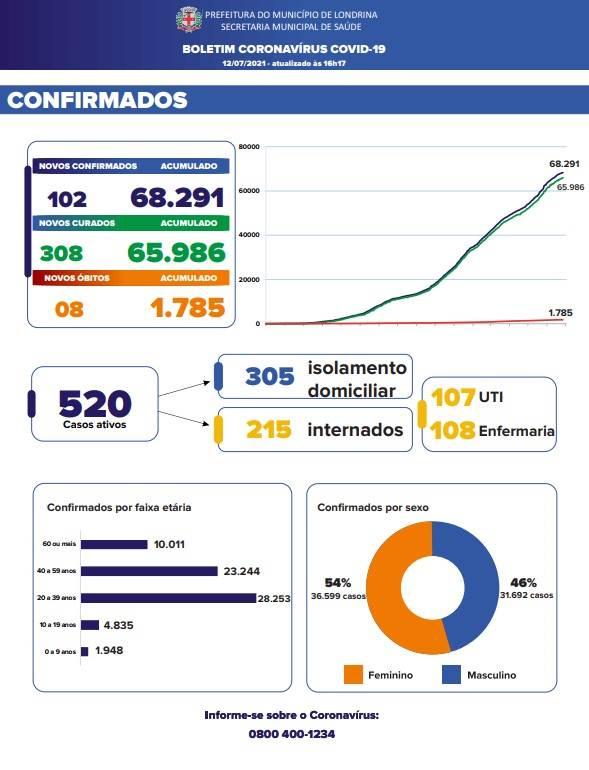 Foram registrados 102 novos casos nas últimas 24 horas, o município chegou a 68.291 confirmações. Londrina registra ainda 520 casos ativos, sendo 305 em isolamento domiciliar com acompanhamento das equipes médicas e 2015 internados - 108 na enfermaria e 107 na Unidade de Terapia Intensiva (UTI).