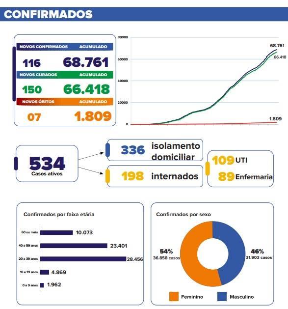 Foram registrados 116 novos casos nas últimas 24 horas, o município chegou a 68.761 confirmações. Londrina registra ainda 534 casos ativos, sendo 336 em isolamento domiciliar com acompanhamento das equipes médicas e 198 internados - 89 na enfermaria e 109 na Unidade de Terapia Intensiva (UTI).