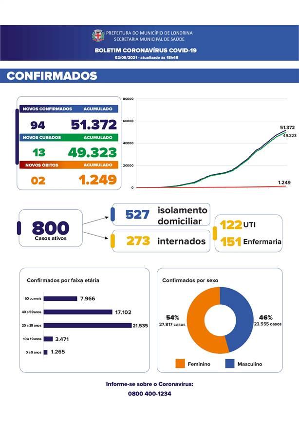 O boletim deste domingo (2) confirmou mais duas mortes por coronavírus em Londrina. Desde o início da pandemia são 1.249 óbitos.