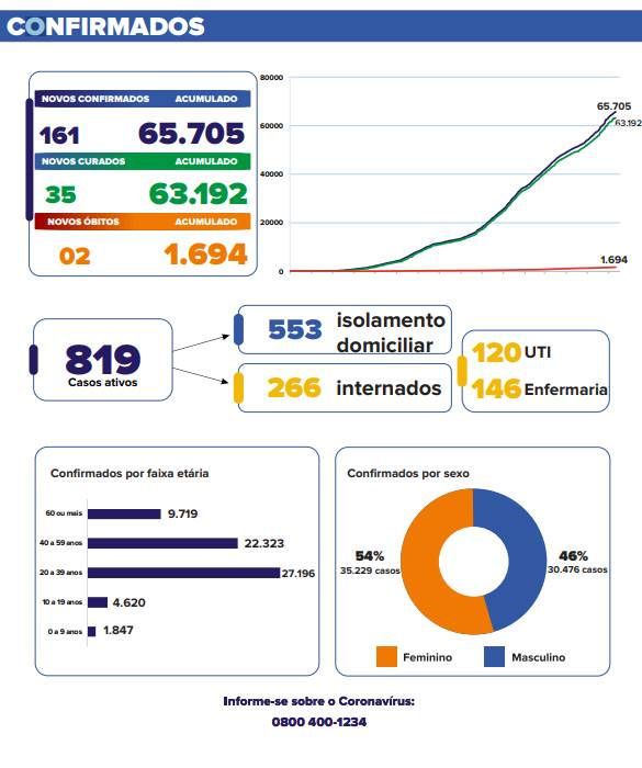 Foram registrados 161 novos casos nas últimas 24 horas, o município chegou a 65.705 confirmações. Londrina registra ainda 819 casos ativos, sendo 553 em isolamento domiciliar com acompanhamento das equipes médicas e 266 internados - 146 na enfermaria e 120 na Unidade de Terapia Intensiva (UTI).