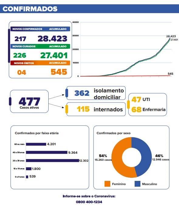 O boletim desta segunda-feira (25) registra mais quatro óbitos e agora o número de moradores que morreram em decorrência da doença é de 545. As vítimas três homens, de 55, 64 e 91 anos, e uma mulher, de 91 anos.
