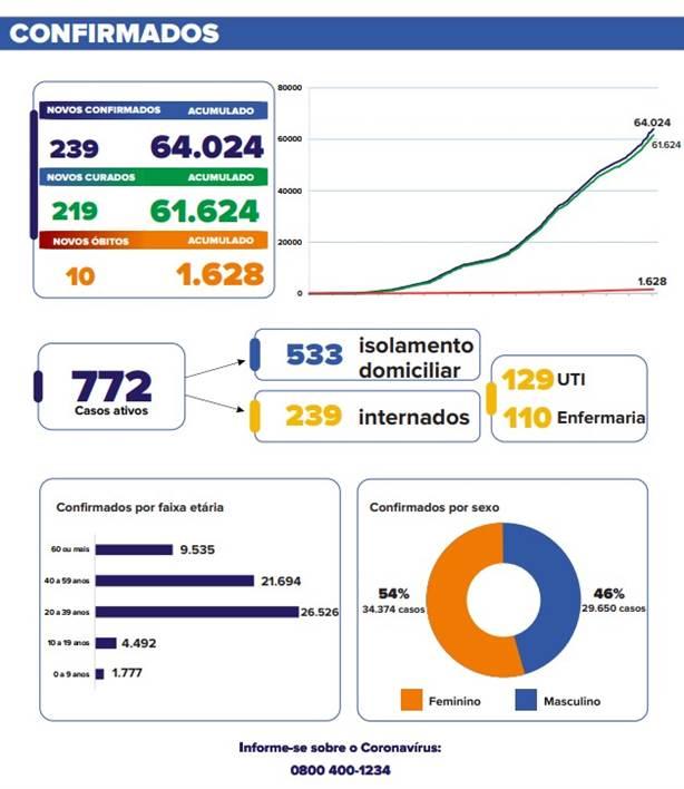 Foram registrados 239 novos casos nas últimas 24 horas, o município chegou a 64.024 confirmações. Londrina registra ainda 772 casos ativos, sendo 533 em isolamento domiciliar com acompanhamento das equipes médicas e 239 internados - 110 na enfermaria e 129 na Unidade de Terapia Intensiva (UTI).