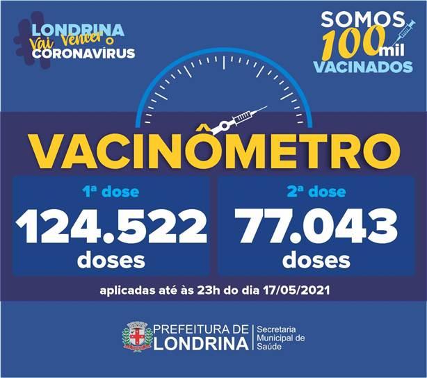 Londrina ultrapassou as 200 mil doses de vacina contra covid-19 aplicadas. Ao todo, foram 201.565. Segundo o Vacinômetro, divulgado pela Secretaria de Saúde, nesta terça-feira (18), até as 23h desta segunda-feira (17), 124.522 pessoas haviam sido vacinadas com a primeira dose do imunizante.