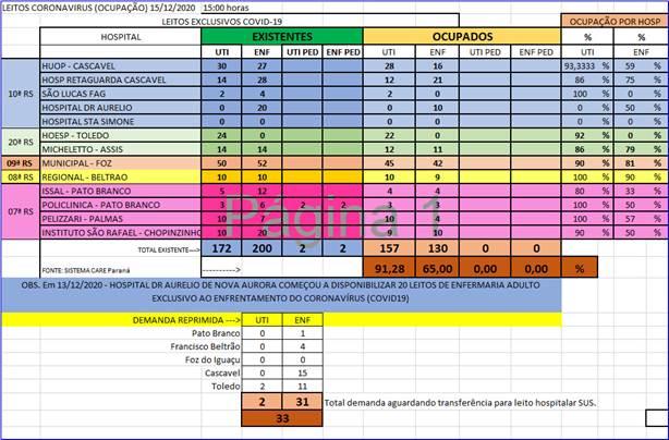 Em Cascavel, são 46 UTI e 42 estão sendo utilizadas uma taxa de 93,33%. Na cidade ainda tem 59 leitos de enfermaria, mas 37 estão com pacientes.