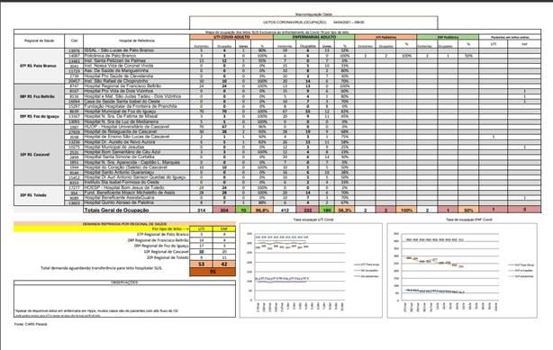 Dos 314 leitos de unidade de terapia intensiva, 304, mas 53 pessoas aguardam por uma vaga. A região tem 412 quartos de enfermaria a atualmente 180 livres.