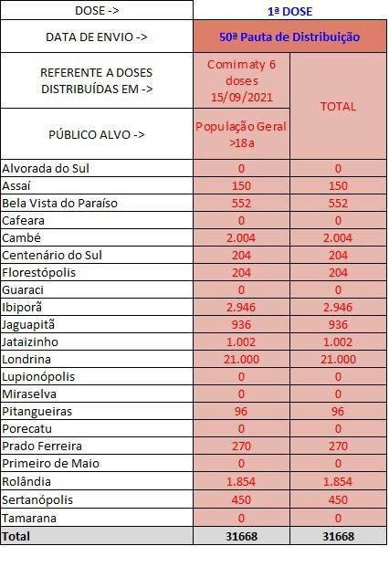Londrina fica com a maior parte das doses: 21 mil. Na sequência, Ibiporã deve ter um adicional de 2.946 e Cambé, 2.004.