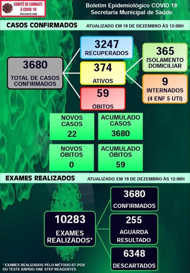 O boletim deste sábado confirmou 22 novos casos de Covid-19. Ao todo, são 3.680 desde o início da pandemia com 59 óbitos no município. Cambé tem 374 casos ativos, com nove internamentos (cinco em UTIs) e 365 casos de isolamento domiciliar.