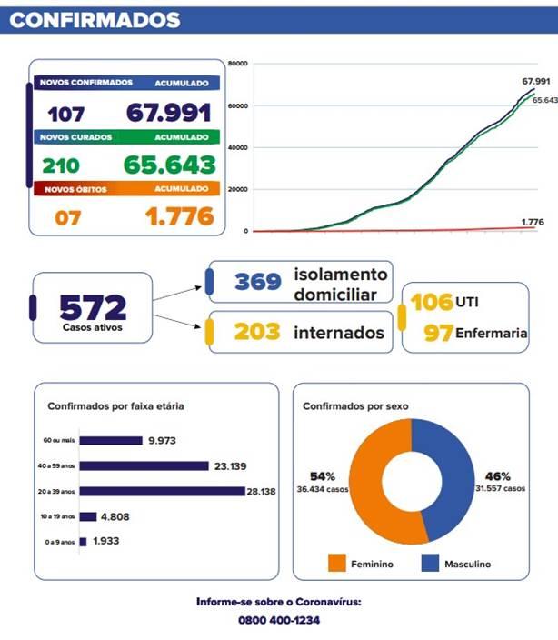 Mais 210 pacientes se recuperaram e agora o número dos considerados curados da doença chegou a 65.643. Atualmente, são 64 pessoas com sintomas da doença que aguardam resultados de exames.