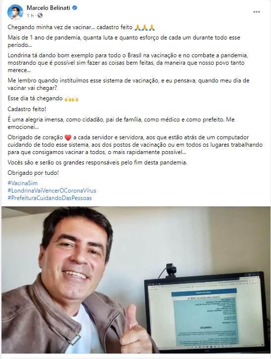O prefeito de Londrina anunciou, em suas redes sociais, que realizou o cadastro para receber a vacina contra Covid-19.