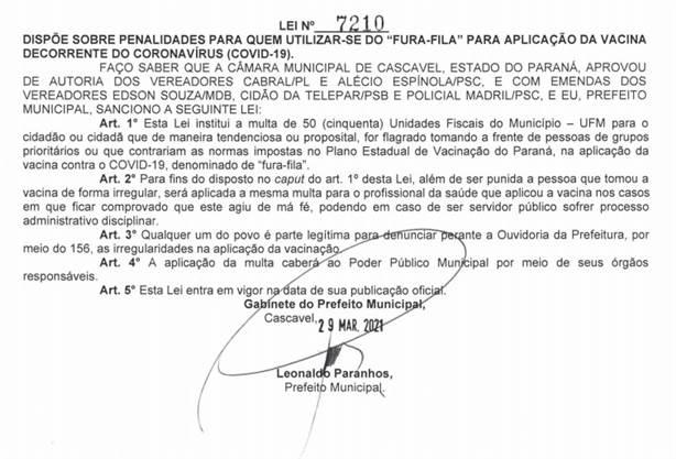 O Prefeito de Cascavel, Leonaldo Paranhos, sancionou na segunda-feira (29), a lei que dispõe sobre penalidades para quem utilizar-se do "fura-fila" para aplicação da vacina da Covid-19.