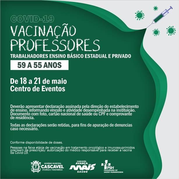 Profissionais da educação da rede pública e privada com 55 a 59 anos serão vacinados entre os dias 18 a 21 de maio.