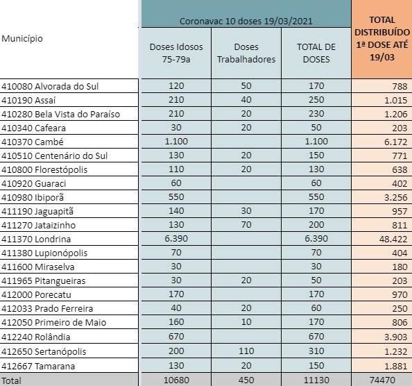 Londrina vai receber 6.390 doses para idosos entre 75 e 79 anos. Esta mesma faixa etária será contemplada com 1.100 doses em Cambé, 670 doses em Rolândia e 550 em Ibiporã.