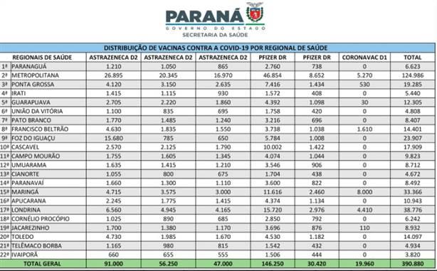 A 17ª Regional de Saúde vai receber 15.670 doses da AstraZeneca/Fiocruz para segunda dose em pessoas que receberam a vacina no começo do segundo semestre; 4.410 doses da CoronaVac/Butantan, destinadas para primeira dose na população adulta que ainda não se vacinou; e 18.696 da Pfizer/BioNTech, para idosos a partir de 60 anos e trabalhadores da saúde, que tenham tomado a D2 ou dose única (DU) até 31 de março.