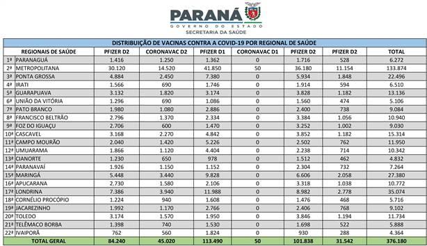 A Secretaria de Estado da Saúde (Sesa) iniciou na tarde desta sexta-feira (10) a distribuição de mais 376.180 vacinas contra a Covid-19 para as 22 Regionais de Saúde do Paraná. São 331.110 imunizantes da Pfizer/BioNTech e 45.070 doses da CoronaVac/Butantan. Há 262.640 vacinas destinadas à segunda dose (D2) e 113.540 para a primeira aplicação (D1).