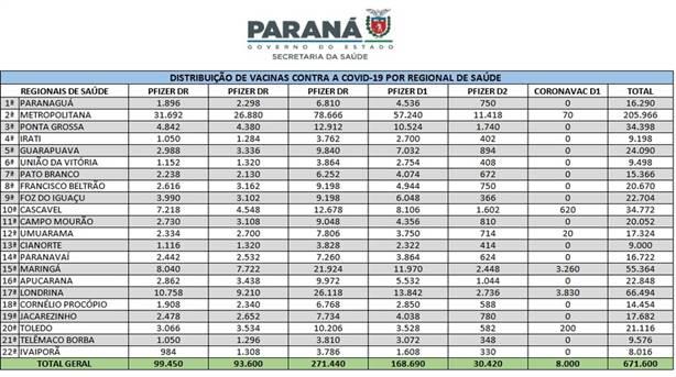 A 17ª Regional de Saúde recebe, nesta quinta-feira (04), 66.494 doses de vacinas contra a Covid-19.