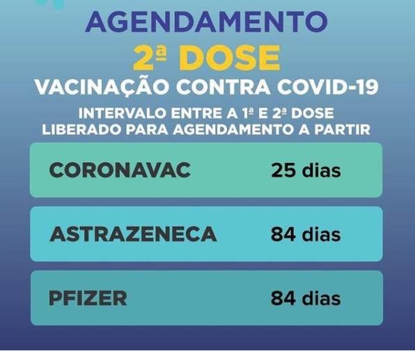 No caso da Coronavac, o intervalo é de 25 dias, e da AstraZeneca e da Pfizer é de 84 dias. Os prazos são os definidos pelo Ministério da Saúde, de acordo com o Programa Nacional de Imunizações (PNI). Diferente das demais, a vacina da Janssen é dose única.