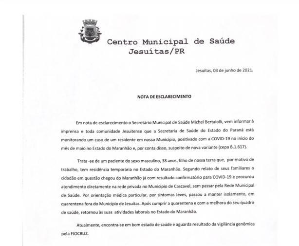 O Paraná está monitorando um caso suspeito da nova variante indiana de Covid-19 em Jesuítas, região Oeste do Paraná.