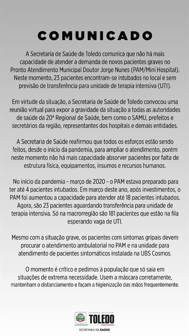 A Secretaria de Saúde de Toledo comunica que não há mais capacidade de atender a demanda de novos pacientes graves no Pronto Atendimento Municipal Doutor Jorge Nunes (PAM/Mini Hospital). Neste momento, 23 pacientes encontram-se intubados no local e sem previsão de transferência para unidade de terapia intensiva (UTI).