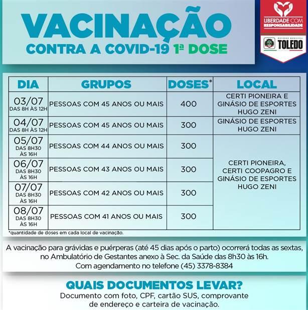 Após o anúncio da chegada de mais 5.203 doses direcionadas ao público geral e profissionais das forças de segurança pela 20ª Regional de Saúde, a Secretaria de Saúde de Toledo anunciou a retomada da aplicação de vacina contra a Covid-19 para as pessoas com mais de 45 anos já neste sábado (03). A vacinação acontece no Centro de Revitalização da Terceira Idade Wilson Carlos Kuhn (Certi Pioneira) e no Ginásio de Esportes Hugo Zeni.