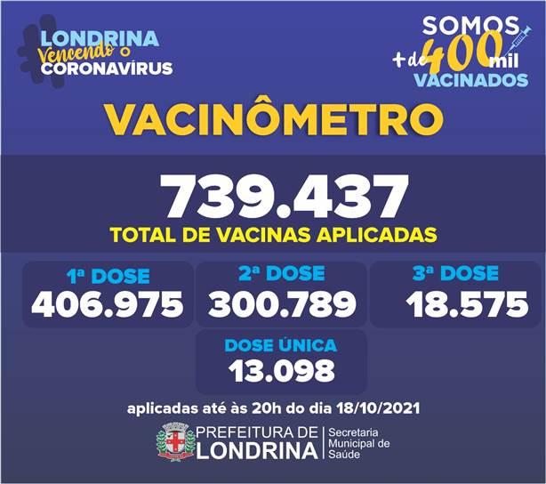 A Prefeitura, por meio da Secretaria Municipal de Saúde, atualizou o vacinômetro nesta terça-feira (19). Segundo o levantamento, foram aplicados até a noite desta segunda-feira (18), 739.437 doses da vacina contra a Covid-19. Em 24 horas foram 3.916 doses. Deste total, 174 tomaram a primeira dose, 5 receberam a vacina de dose única, 3.194 a segunda dose e 543 a terceira dose de reforço.