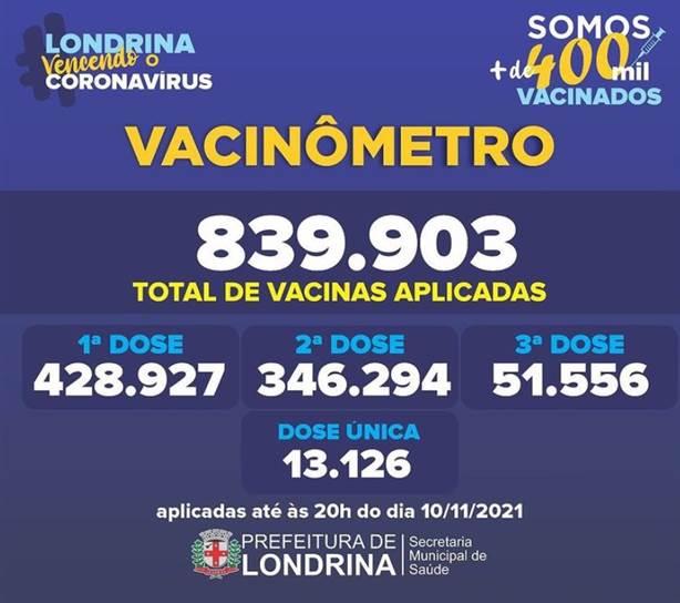 Londrina tem 839.903 doses da vacina contra Covid-19 aplicadas, segundo o Vacinômetro divulgado nesta quinta-feira (11). Em 24 horas, foram 3.964 pessoas que receberam a vacina.