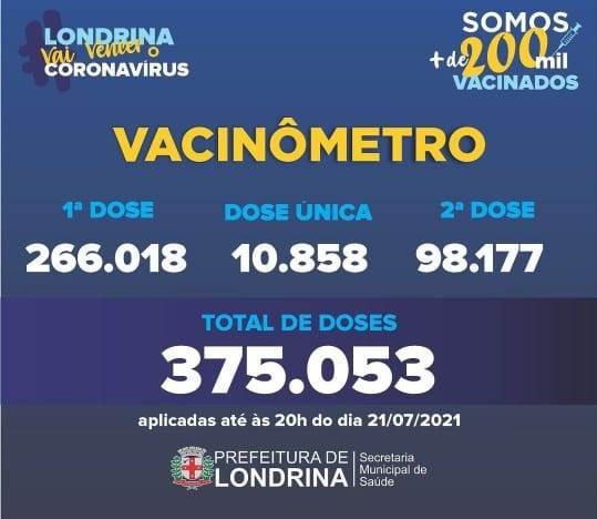 Londrina vacinou 3583 pessoas contra Covid-19 em 24 horas. A atualização do vacinômetro foi divulgada nesta quinta-feira (22).