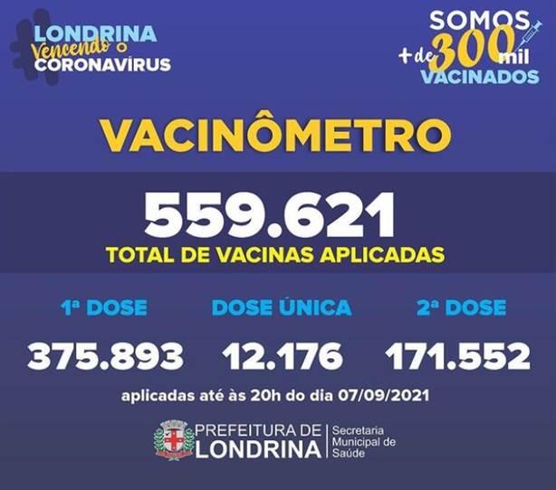 Segundo o Vacinômetro divulgado nesta quarta-feira (08), Londrina aplicou 559.621 doses da vacina contra Covid. Deste total, 375.893 pessoas tomaram a primeira dose, 171.552 pessoas tomaram duas doses e outras 12.176 a vacina em dose única e estão completamente imunizadas contra a Covid-19.