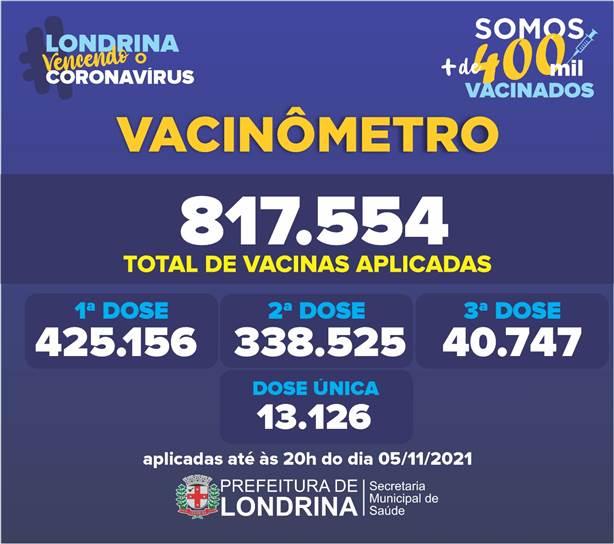 Londrina tem 817.554 doses da vacina contra Covid aplicadas, segundo o Vacinômetro divulgado nesta sábado (6). Além disso, 351.651 pessoas estão completamente vacinadas na cidade.