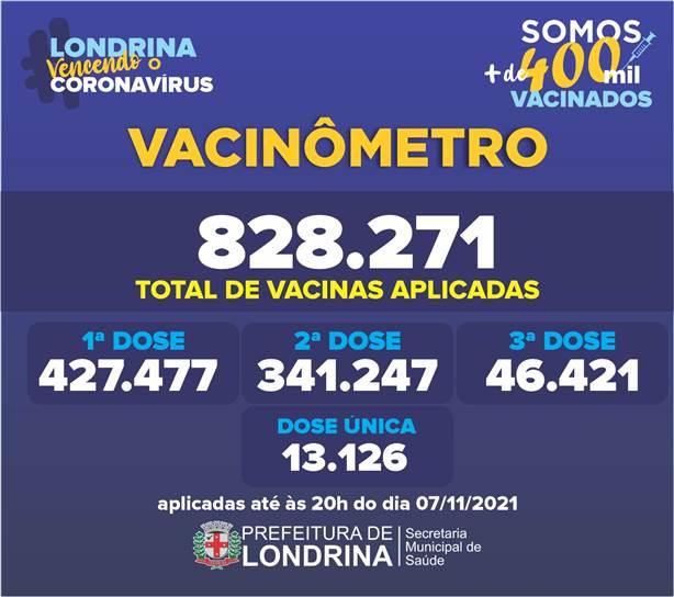 Londrina tem 828.2715 doses da vacina contra Covid-19 aplicadas, segundo o Vacinômetro divulgado nesta segunda-feira (08). em 24 horas, foram 4.976 pessoas que receberam a vacina.