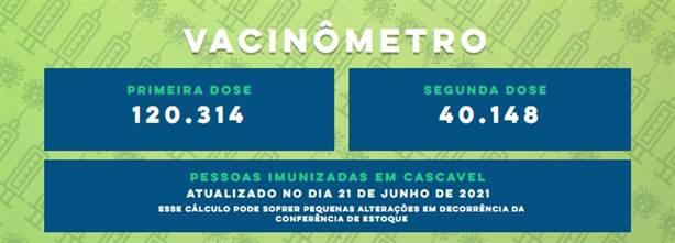Cascavel aplicou 160.462 doses de vacina contra a Covid-19. Segundo os dados divulgados pela Prefeitura da cidade, até o momento 120.314 pessoas receberam a primeira dose. Outras 40.148 foram vacinadas com a segunda.