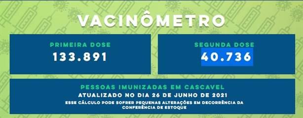 Cascavel aplicou 174.627 doses de vacina contra a Covid-19. Segundo os dados divulgados pela Prefeitura da cidade, até o momento 133.891 pessoas receberam a primeira dose. Outras 40.736 foram vacinadas com a segunda.