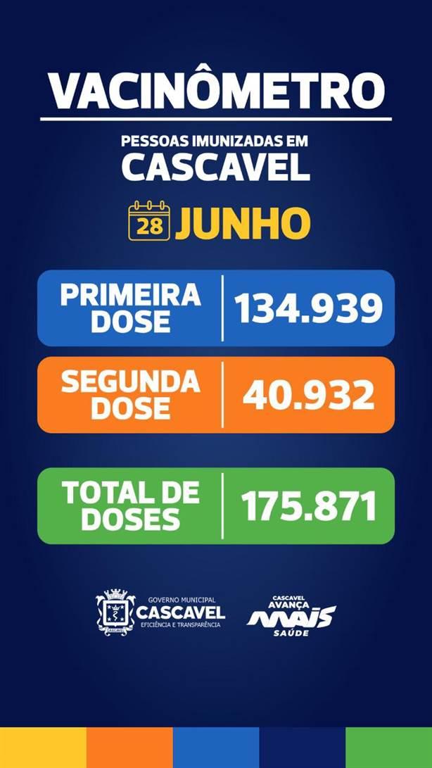Cascavel aplicou 175.871 doses de vacina contra a Covid-19. Segundo os dados divulgados pela Prefeitura da cidade, até o momento 134.939 pessoas receberam a primeira dose. Outras 40.932 foram vacinadas com a segunda.