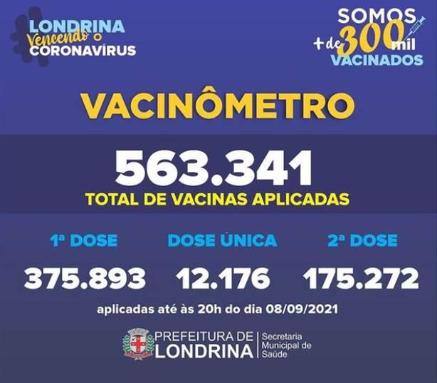 Segundo o Vacinômetro divulgado nesta quinta-feira (08), Londrina aplicou 563.341 doses da vacina contra Covid. Todas as 3720 doses foram de segunda aplicação. O número de pessoas que tomaram a primeira dose se manteve em 375.893, outras 12.176 a vacina em dose única e estão completamente imunizadas contra a Covid-19.