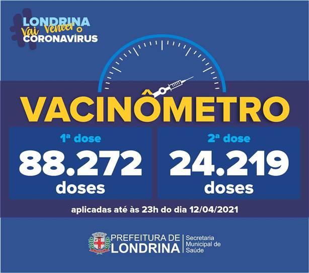 Londrina chegou a marca de 88.272 pessoas imunizadas com a 1ª dose contra a Covid-19. A informação é do vacinômetro, divulgado diariamente pela prefeitura. Até às 23h, desta segunda-feira (12), a informação é que 24.219 pessoas também tinham recebido a 2ª dose.