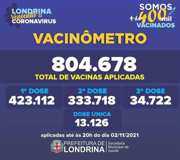 Londrina chegou a marca de mais de 346 mil pessoas completamente vacinadas contra Covid-19, segundo o Vacinômetro divulgado nesta quarta-feira (3). Além disso, mais de 800 mil vacinas foram aplicadas.