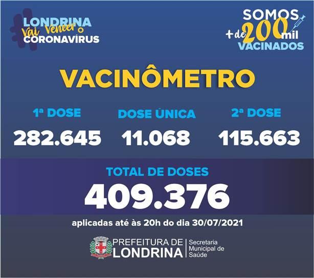 A Prefeitura de Londrina, por meio da Secretaria Municipal de Saúde, aplicou mais 3.636 doses da vacina contra a Covid-19 até a noite de sexta-feira (30). Segundo o Vacinômetro deste sábado (31), deste total, 1.430 tomaram a primeira dose; 2.175 a segunda dose e 31 tomaram a vacina de dose única. A cidade já tem 126.731 pessoas completamente imunizadas contra a Covid-19. A Prefeitura já aplicou 409.376 doses de vacinas contra a Covid.