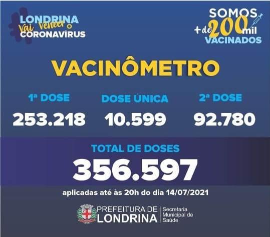Londrina passou das 350 mil doses de vacina contra a covid-19 aplicadas. Ao todo, 356.597 pessoas receberam ao menos, uma aplicação do imunizante contra a doença. A atualização do vacinômetro foi divulgada nesta quinta-feira (15)
