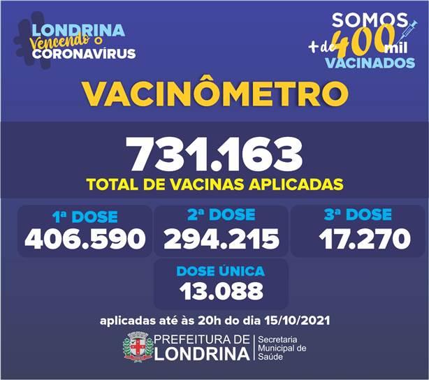 A Prefeitura, por meio da Secretaria Municipal de Saúde, aplicou até a noite de sexta-feira (15), 3.987 doses da vacina contra a Covid-19. Segundo o Vacinômetro, deste total, 164 tomaram a primeira dose, 50 receberam a vacina de dose única, 3.231 a segunda dose e 542 a terceira dose de reforço. A cidade já tem 307.303 pessoas completamente imunizadas contra a Covid-19. A Prefeitura já aplicou 731.163 doses de vacinas contra a Covid.